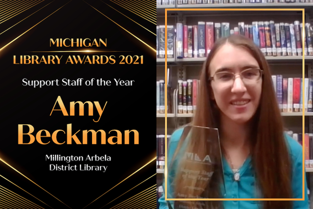 The 2021 Library Support Staff of the Year Award was awarded to Amy Beckman from the Millington Arbela District Library. This award recognizes a support staff professional who goes above and beyond to provide support at their library and who has advanced and strengthened the image of support staff.