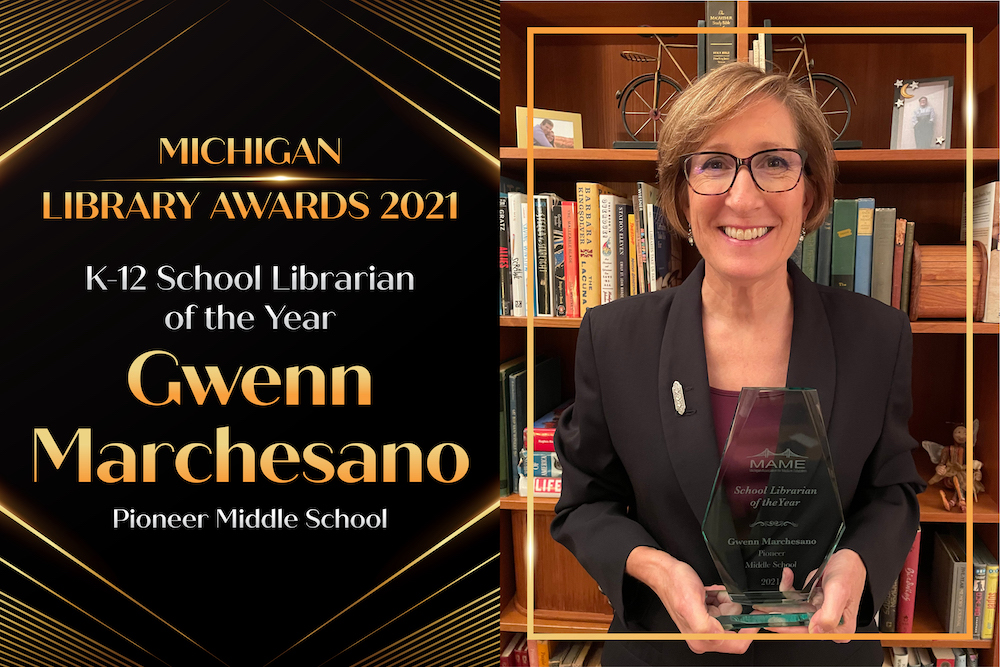 The 2021 School Librarian of the Year was awarded to Gwenn Marchesano from Pioneer Middle School in Plymouth, MI. This award celebrates and honors those who have championed school libraries through volunteerism, administrative support and advocacy.