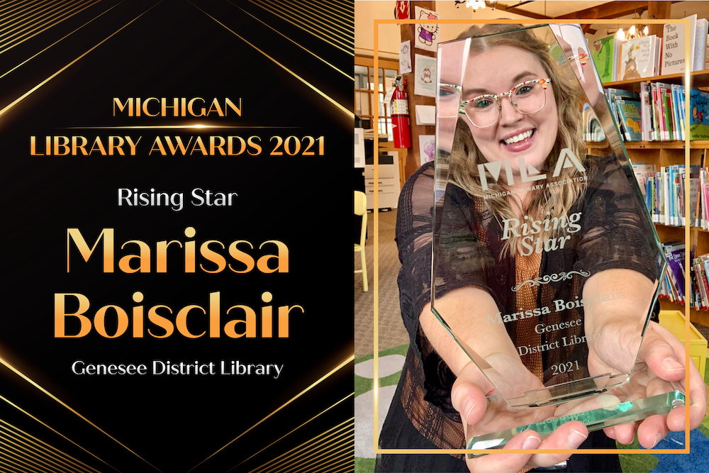 The 2021 Rising Star Award was awarded to Marissa Boisclair from the Genesee District Library. The Rising Star Award recognizes a librarian who shows leadership early in their career. While new to the profession, winners of this award are forward-thinking, expanding the role of librarian and moving libraries into the future.