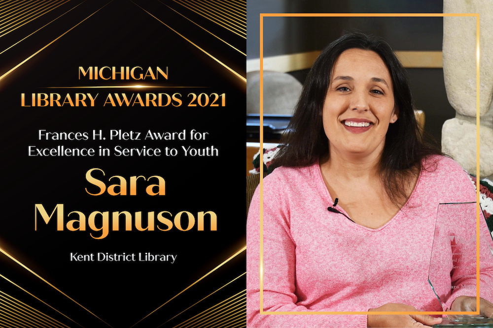 “Sara embodies the spirit of the Frances H. Pletz Award for Excellence in Service to Youth,” said Lance Werner, Executive Director of Kent District Library. “She's passionate about libraries, which is huge understatement. Her dedication and commitment and enthusiasm are contagious, which is also a huge understatement. And her service to youth in our area has a lasting impact on our children, as well as our communities.”