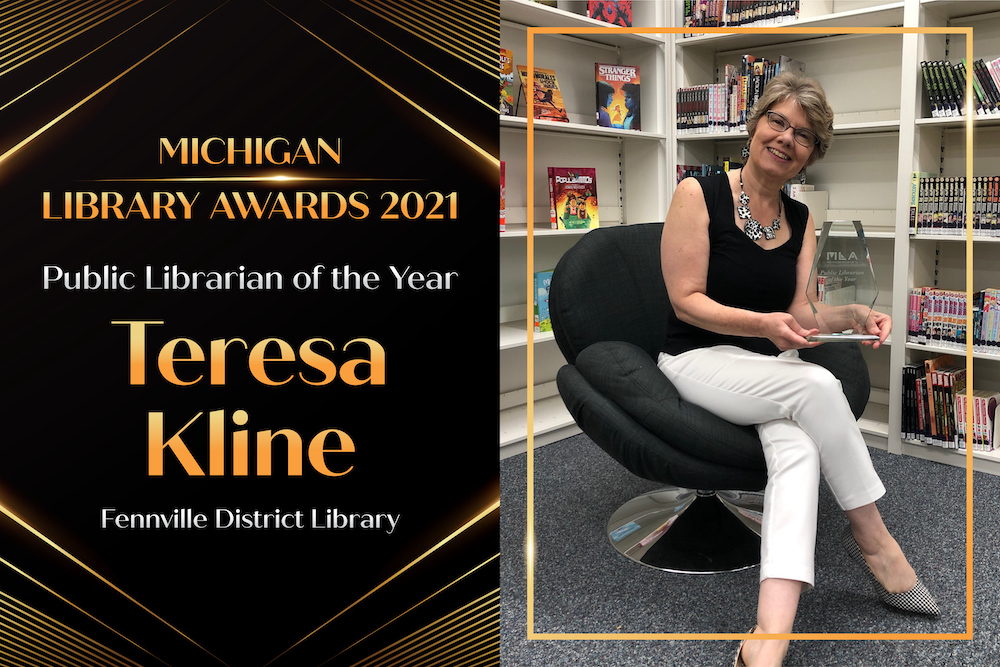 The 2021 Public Librarian of the Year Award was awarded to Teresa Kline of the Fennville District Library. This award recognizes outstanding library professionals that inspire people, provide innovative library service to their community, promote collaboration among libraries, and show evidence of personal and professional achievement as well as initiative and creativity.
